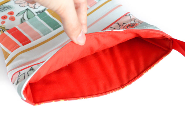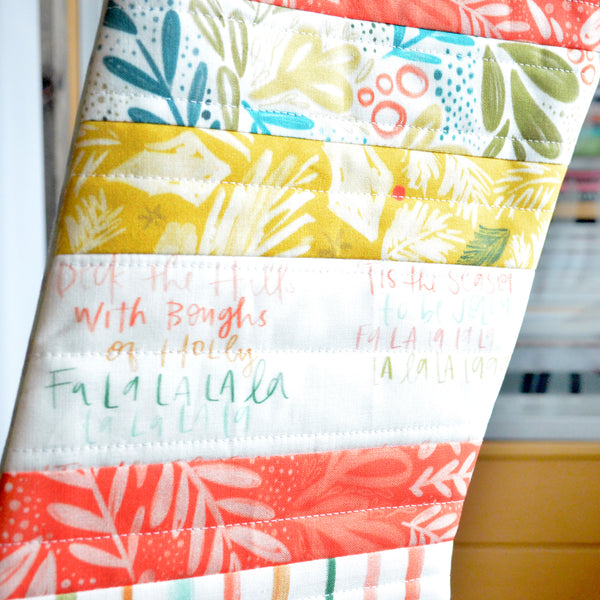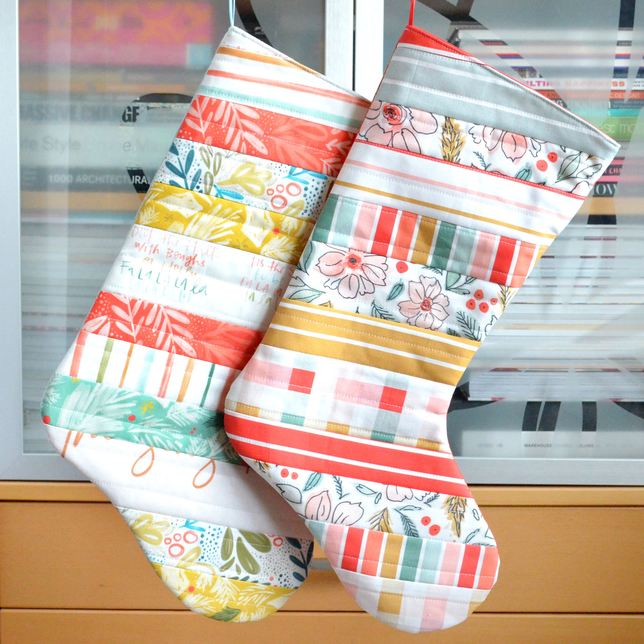 These brand new holiday stockings feature a variety of beautiful prints and patterns, sewn into a fun patchwork-strip design! Their patchwork-nature means that no two stockings are sewn together exactly the same, making each one truly a one-of-a-kind addition to your holiday decor! On the back-side you'll find a coordinating cotton fabric, with a solid colour on the interior lining.