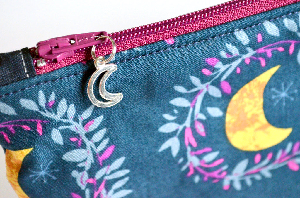 ★ This navy essential oil pouch features a fun moon-print fabric, accented by a cork leather bottom