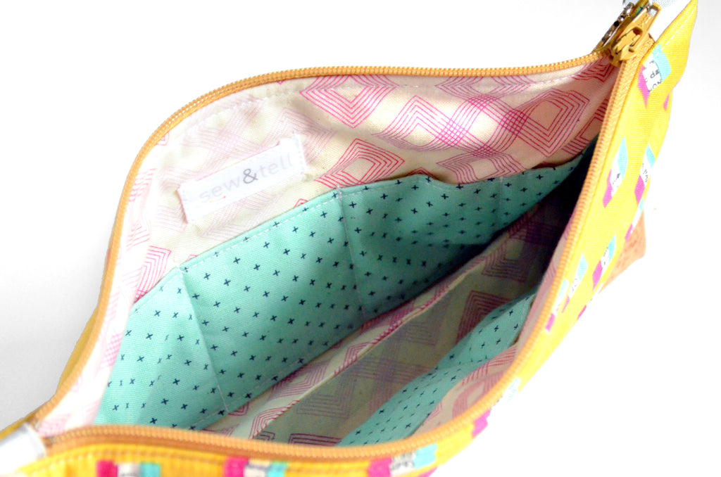 ★ This yellow essential oil pouch features a fun collage-print fabric, accented by a cork leather bottom