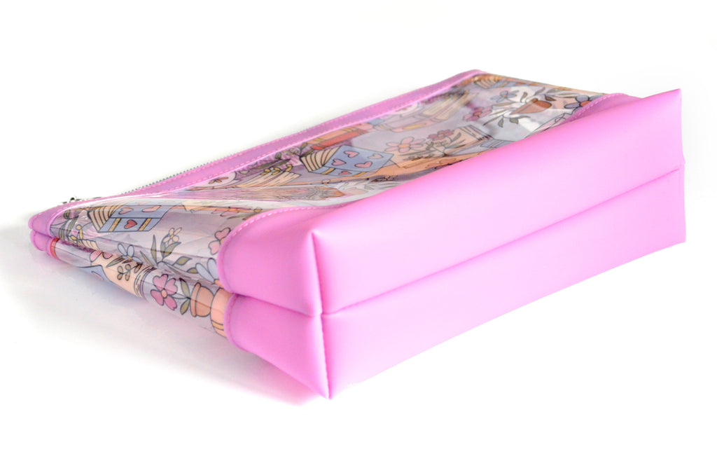 ★ This fun cosmetic bag is made with a book-print clear TPU vinyl & accented with a pink jelly vinyl! Please note, exact fabric placement may vary from some of the photos shown.