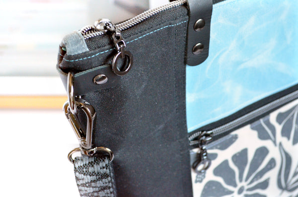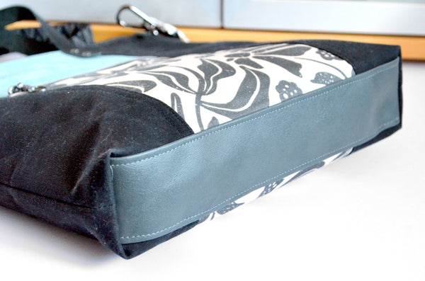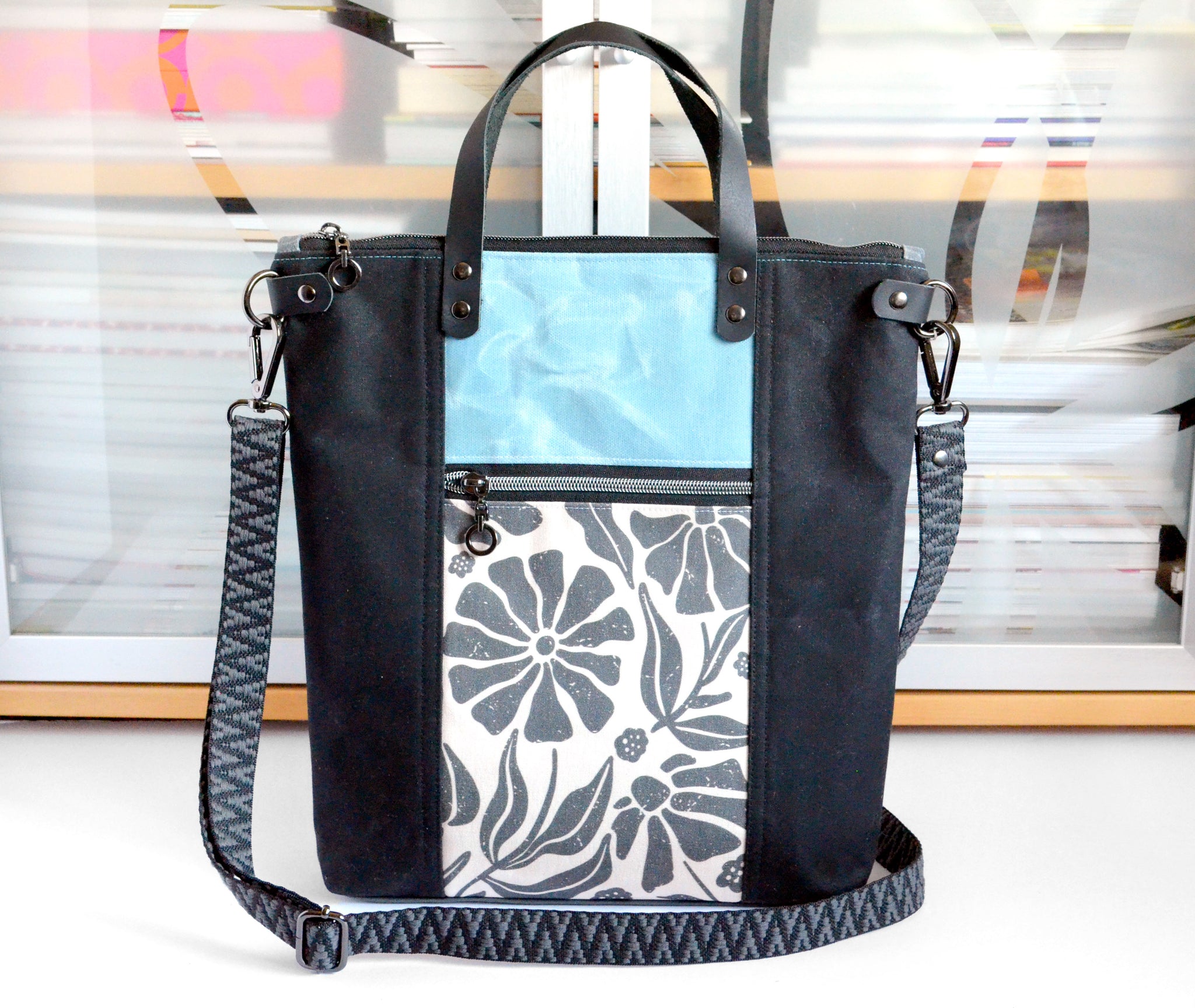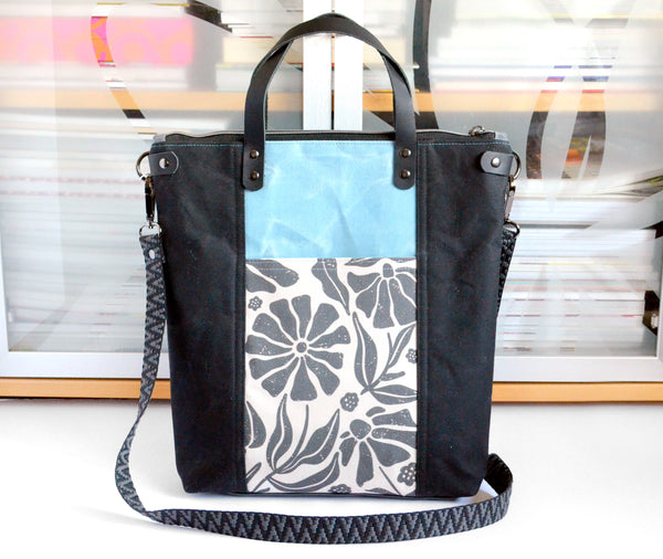 โ˜… This tote bag features a black & bright-blue waxed-canvasย exterior, with a beautiful floral canvas feature panel!ย This bag includes a coordinating adjustable crossbody strap.