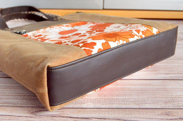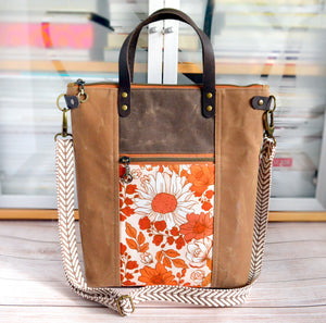 This tote bag features a tan & dark brown waxed-canvasย exterior, with a beautiful floral canvas feature panel!ย This bag includes a coordinating adjustable crossbody strap.