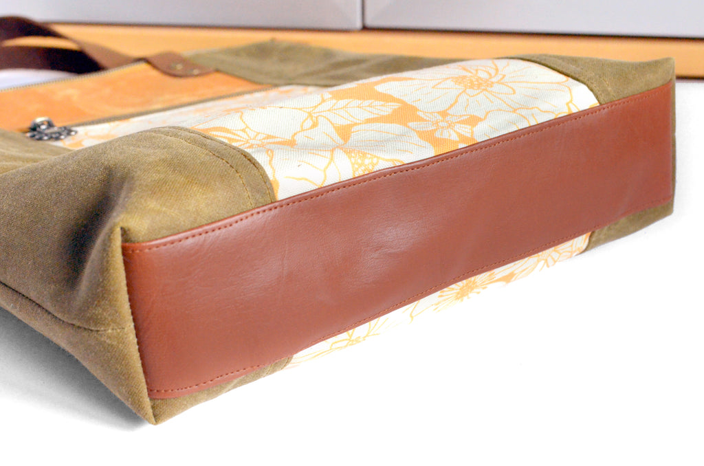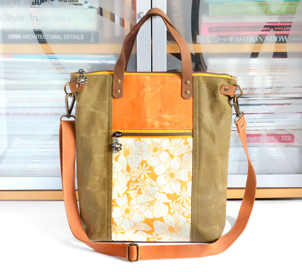 โ˜… This tote bag features an ochre-brownย waxed-canvasย exterior, with a beautiful bright orange floral canvas feature panel!ย This bag includes a coordinating adjustable crossbody strap.