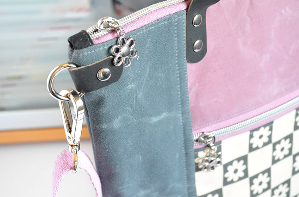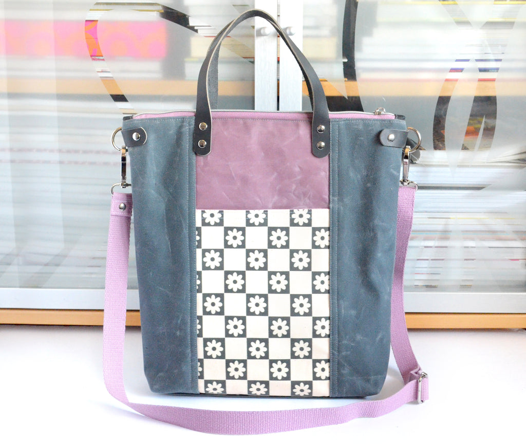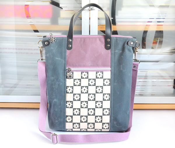 This tote bag features a grey & light purple waxed-canvasย exterior, with a beautiful daisy canvas feature panel! This bag includes a coordinating adjustable crossbody strap.