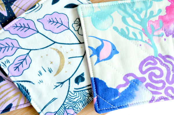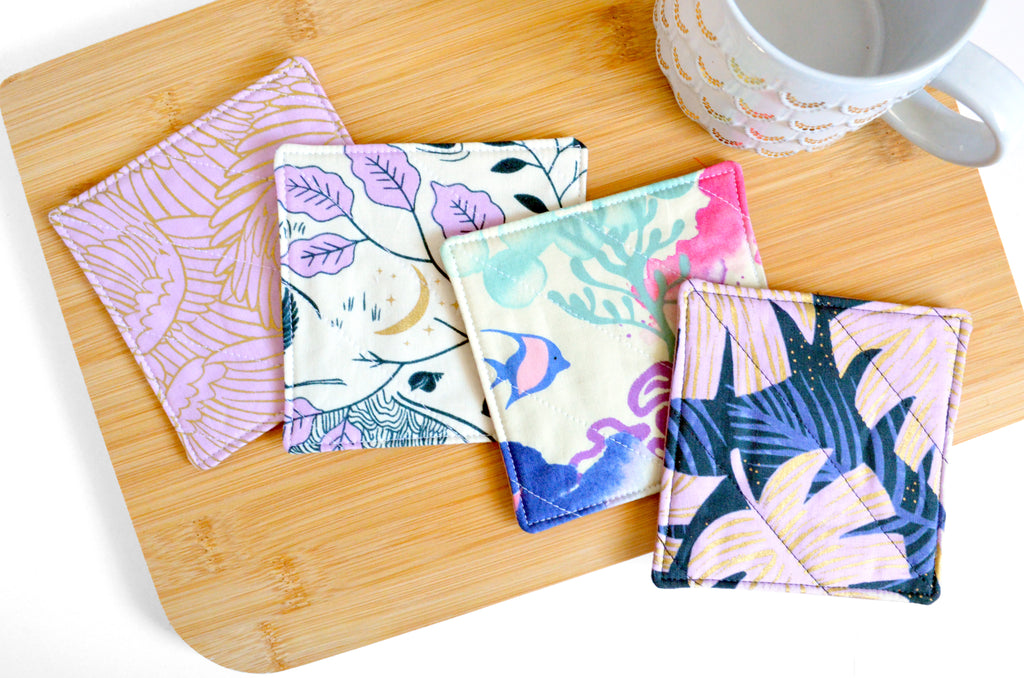 Our quilted fabric coaster sets are sure to bring a pop of colour to your coffee table or dining room, while also providing you with practicality and versatility! Made with a layer of cotton quilt-batting inside, these coasters are great at soaking up unwanted condensation from your drink, and wonโt stick to your glass when you pick it up! Available in a wide-range of fun prints and colours, these coasters also make for the perfect unique housewarming or hostess gift!