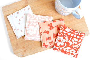 โข Coasters are reversible, with a coordinating fabric print on the back