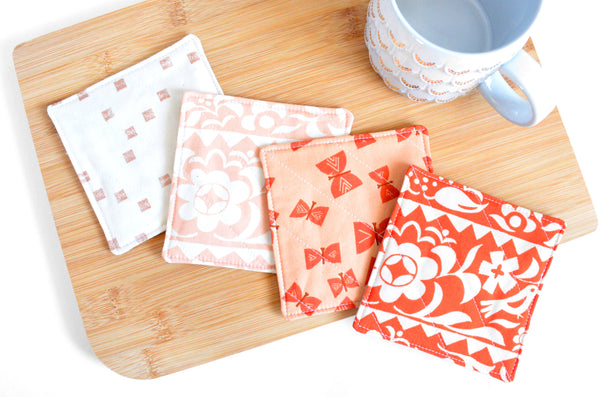Our quilted fabric coaster sets are sure to bring a pop of colour to your coffee table or dining room, while also providing you with practicality and versatility! Made with a layer of cotton quilt-batting inside, these coasters are great at soaking up unwanted condensation from your drink, and wonโt stick to your glass when you pick it up! Available in a wide-range of fun prints and colours, these coasters also make for the perfect unique housewarming or hostess gift!