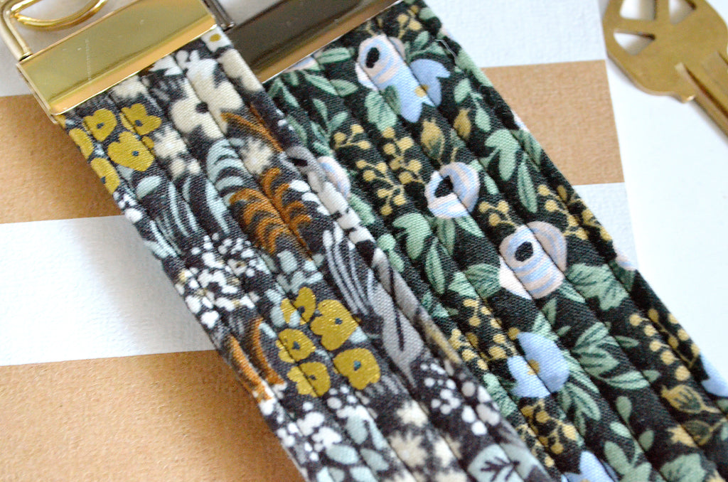 โ These black key fobs feature a variety of beautiful Rifle Paper Co fabrics! Please note that exact fabric placement may vary, as shown in the photos.
