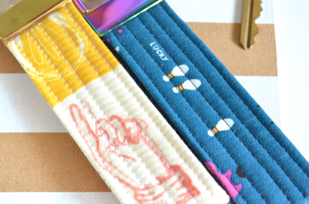 โ These blue, yellow, & beige key fobs feature a variety of fun lucky charm-print fabrics! Please note that exact fabric placement may vary, as shown in the photos.