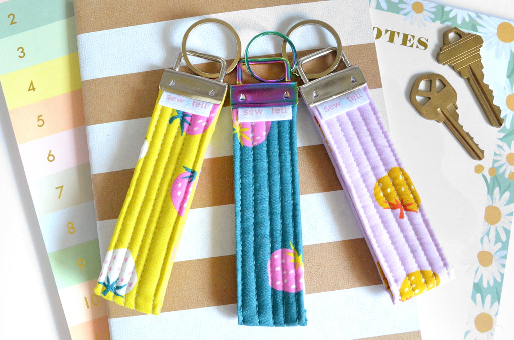โ˜… These blue, yellow, and purple key fobs feature a variety of fun strawberry-print fabrics! Please note that exact fabric placement may vary, as shown in the photos.