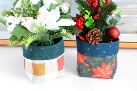 Plaid Poinsettia Holiday Fabric Plant Pot
