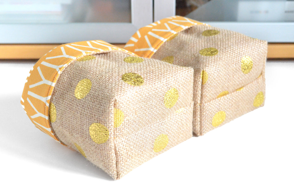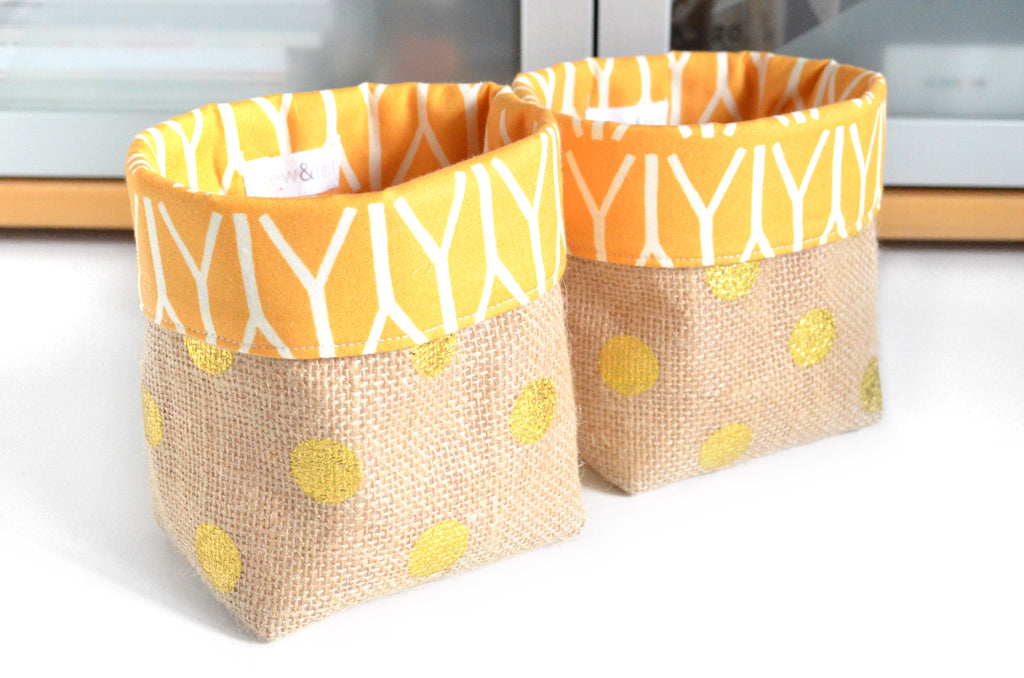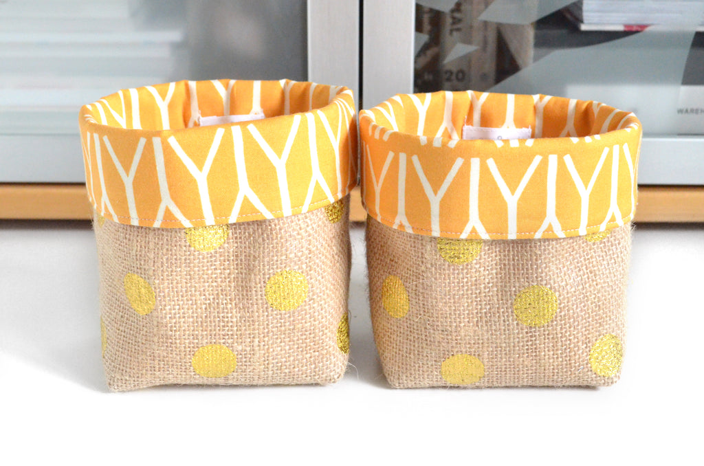 โ These fabric pots are made from aย fun metallic polka-dot burlap fabric, with coordinating linings which peek out the top!ย