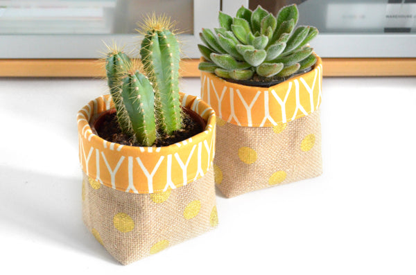 These fun fabric plant pots are made from a variety of beautiful cotton-canvas prints, with bright coordinating lining fabrics which peek out the top! These fabric covers are the perfect solution to the ugly plastic pot your plant comes home in from the store, with no more need for messy re-potting. Just slip your existing plant pot into this bin, and voila! Theyโre even height-adjustable to perfectly suit different sizes of plants, or when adapting these bins for other specific needs. These little buckets also make the perfect container for holding pens and pencils on your desk, cosmetic brushes in the bathroom, essential oils on your nightstand, or any other odds and ends you need to keep organized. Their versatile uses make these a great gift for gardeners, co-workers, teachers, or yourself!