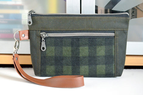 Waxed Cotton Green Plaid Double-Zip Wristlet