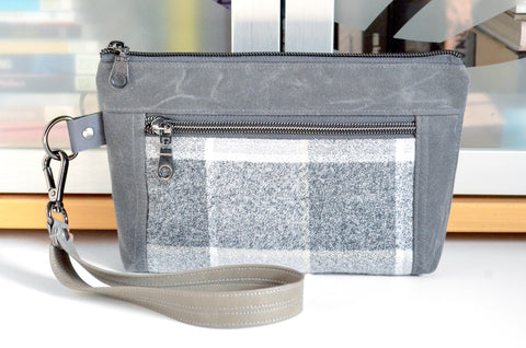 Waxed Canvas Light Grey Plaid Double-Zip Wristlet
