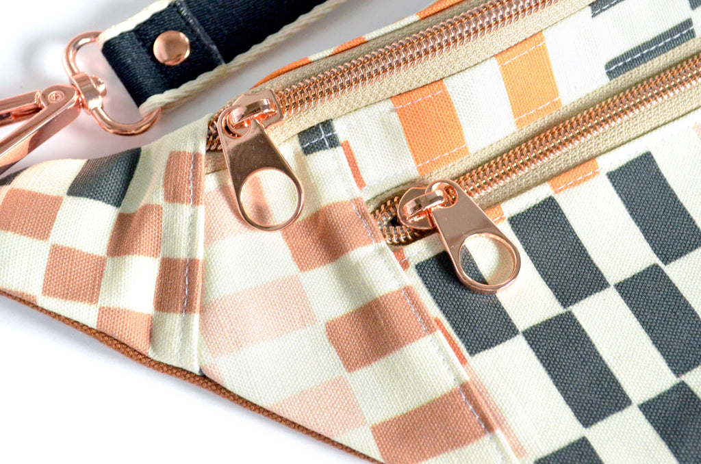 ★ This fanny pack features a black & brown checker print canvas fabric exterior, with a matching interior! This bag also includes a coordinating adjustable cotton webbing strap.