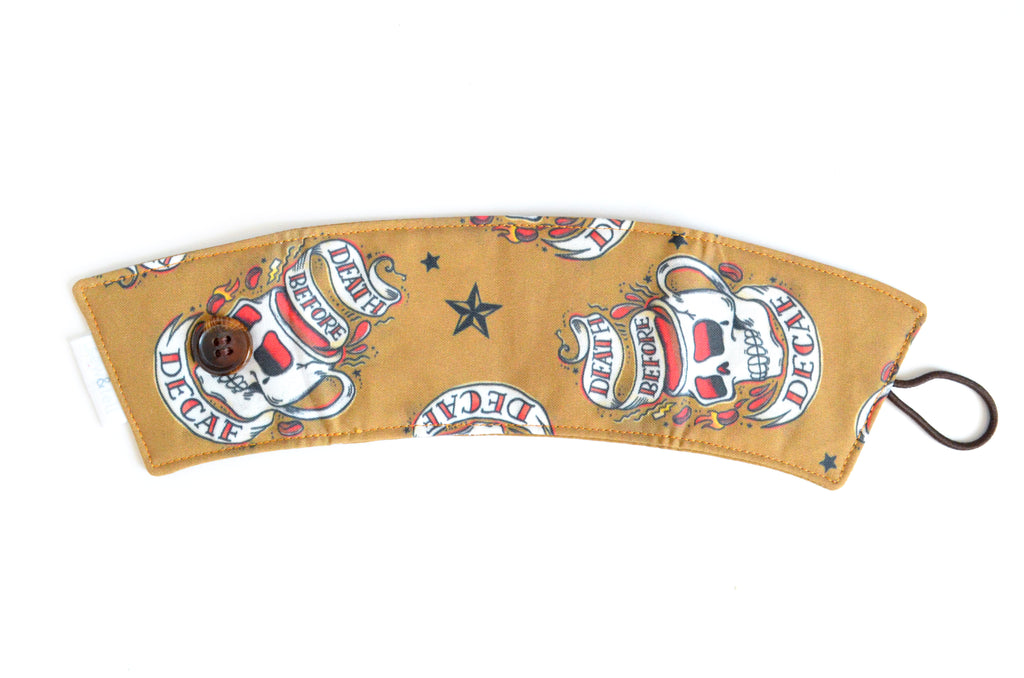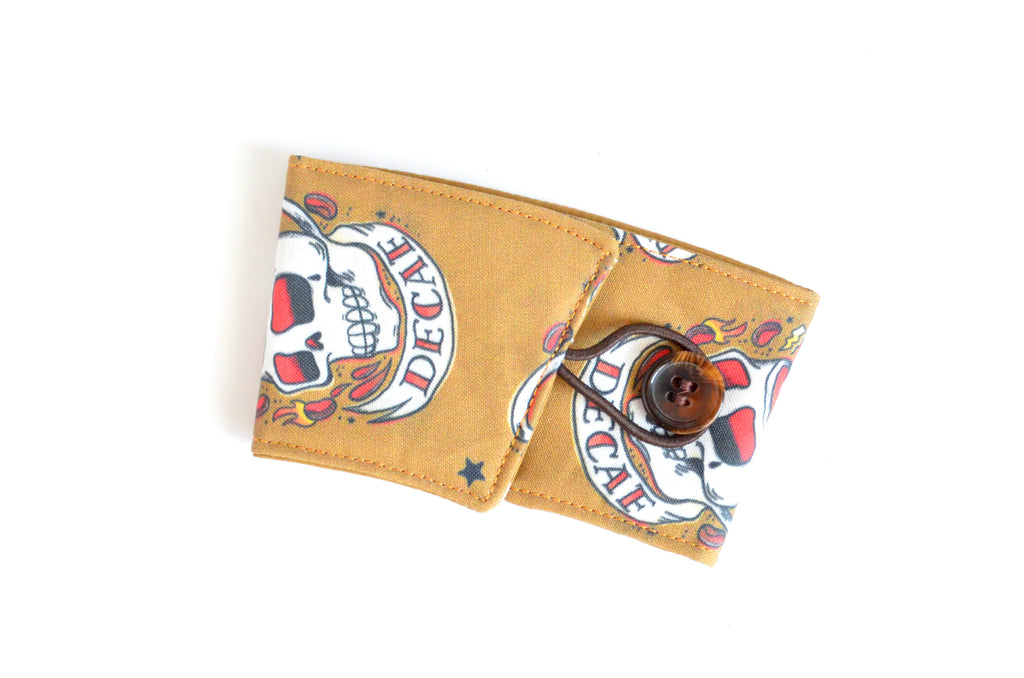 โ These brownย coffee sleeves feature a fun coffee-themed design from Canadian artist and illustrator Cynthia Frenette!ย Each one is paired with a matching button! Please note, exact fabric placement or button style may vary from some of the photos shown.