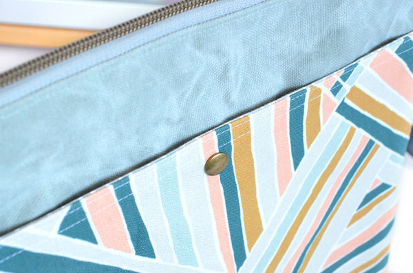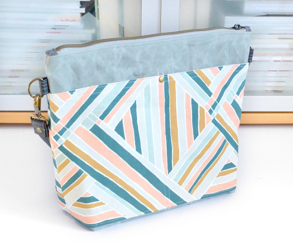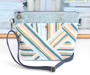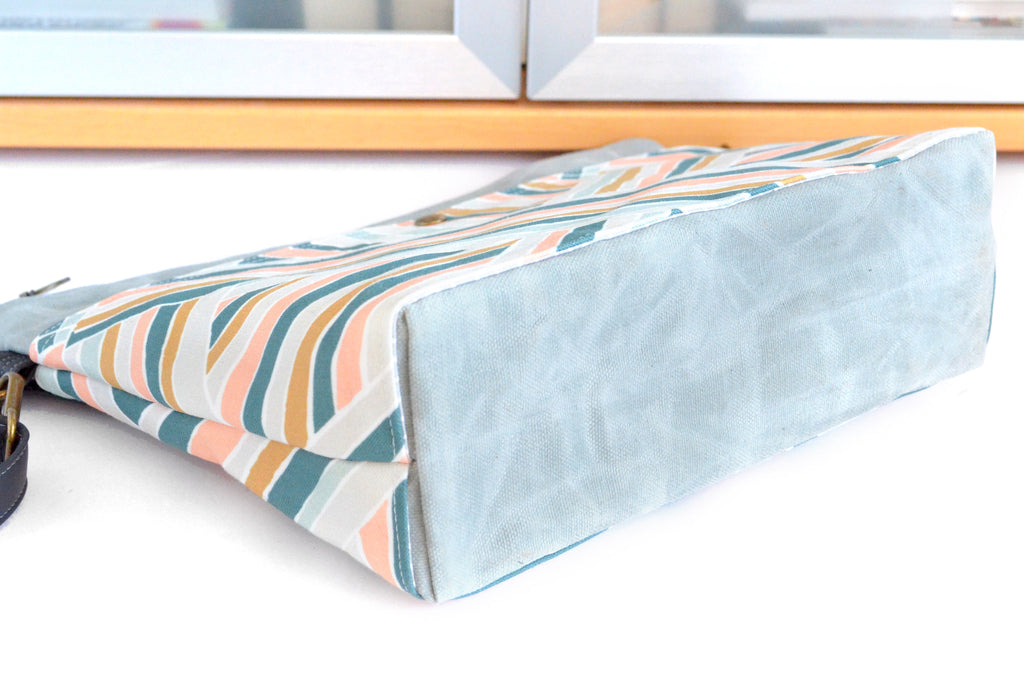 This crossbody bag features a lovely sky-blue waxed-canvas exterior, with a beautiful striped feature fabric! This bag includes a coordinating adjustable faux-leather crossbody strap.