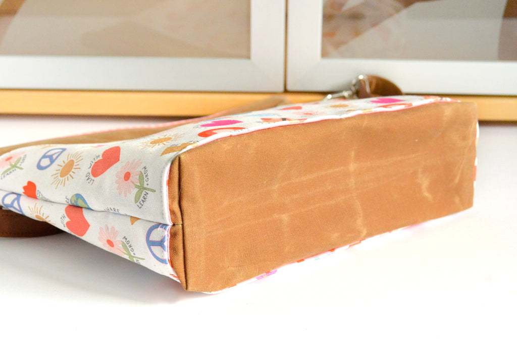 This crossbody bag features a lovely saddle-brown waxed-canvas exterior, with a fun affirmation-icon feature fabric! This bag includes a coordinating adjustable faux-leather crossbody strap.