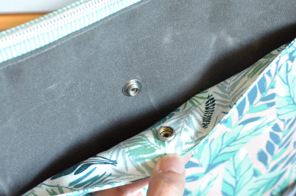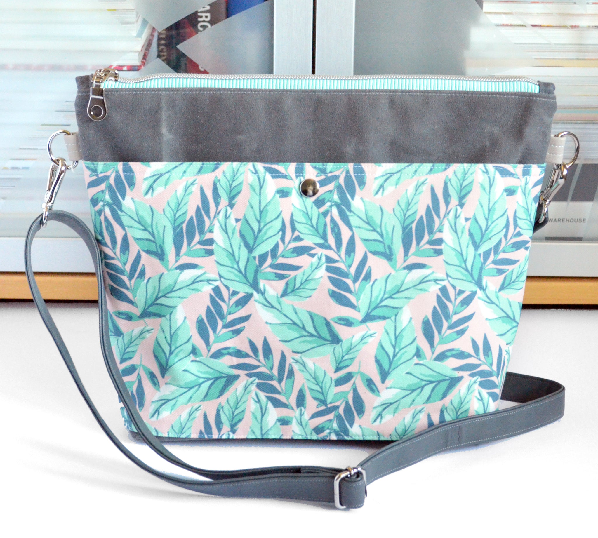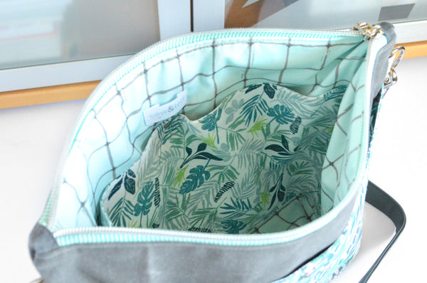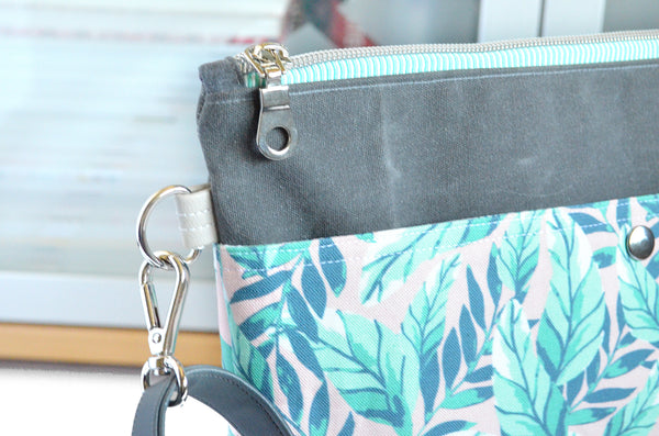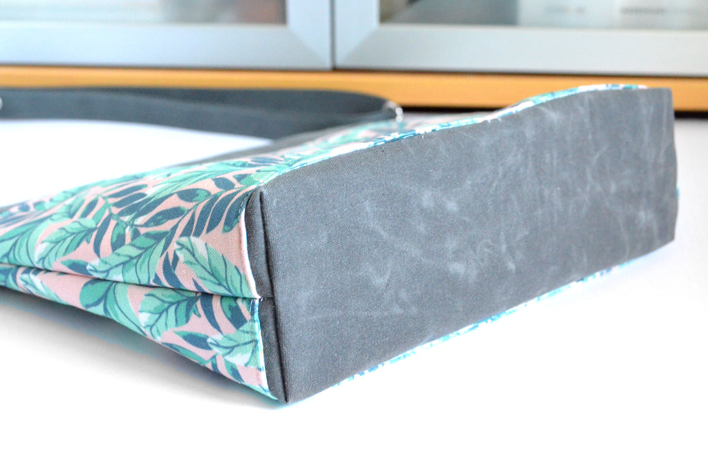 โ This crossbody bag features a lovelyย greyย waxed-canvasย exterior, with a beautifulย pink & green tropical feature fabric!ย This bag includes a coordinating adjustable faux-leather crossbody strap.