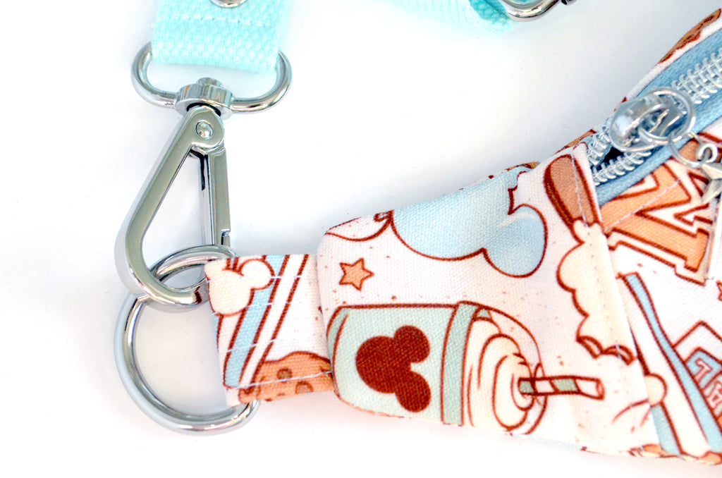 ★ This fanny pack features a blue & white character-print canvas exterior, with a matching interior! This bag also includes a coordinating adjustable cotton webbing strap.