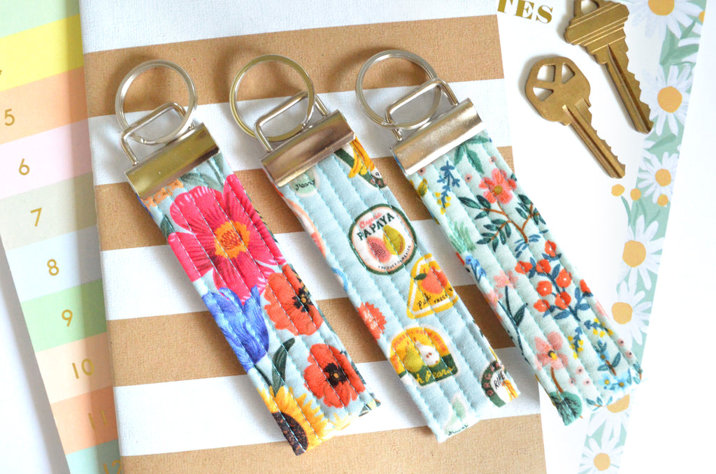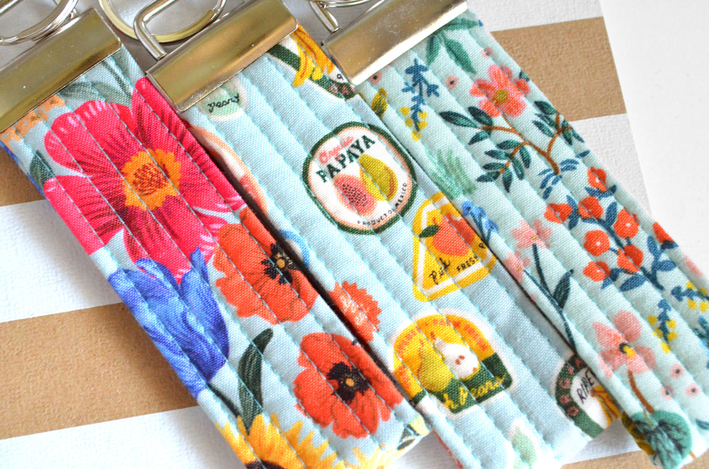 โ These blue key fobs feature a variety of fun Rifle Paper Co print fabrics! Please note that exact fabric placement may vary, as shown in the photos.