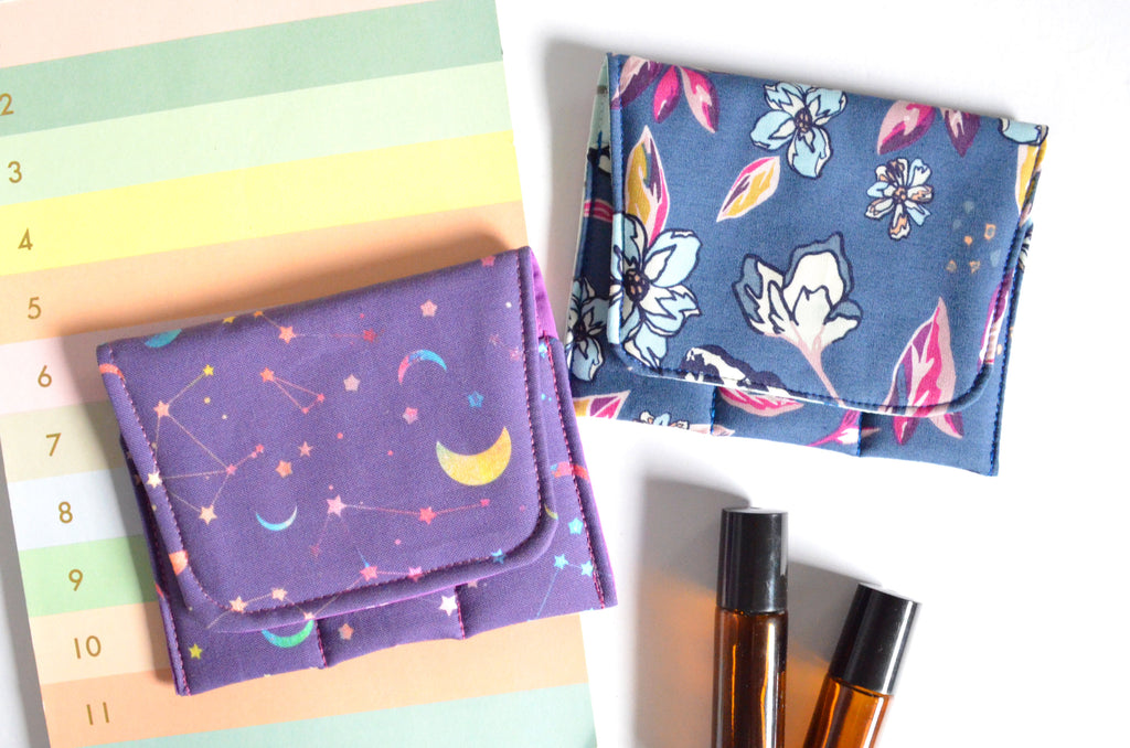 โ These purple & blue roller-bottle holders features two fun floral & celestial-print fabrics!ย