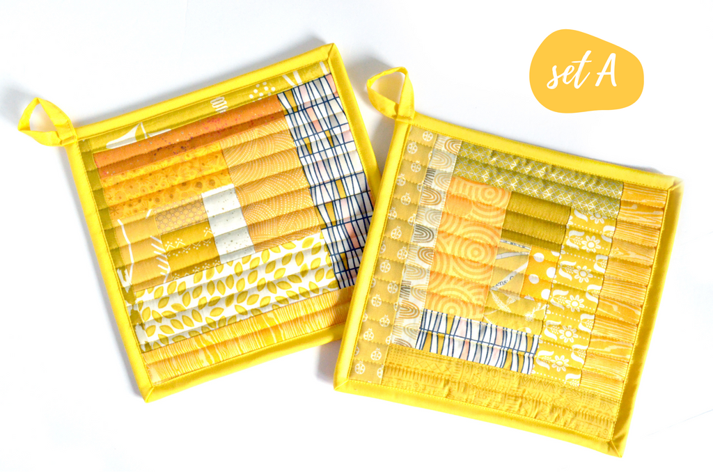 โ This yellow potholder set features a beautiful mix of cotton fabrics, sewn and quilted into a modern take on the traditional โlog-cabinโ quilt block.
