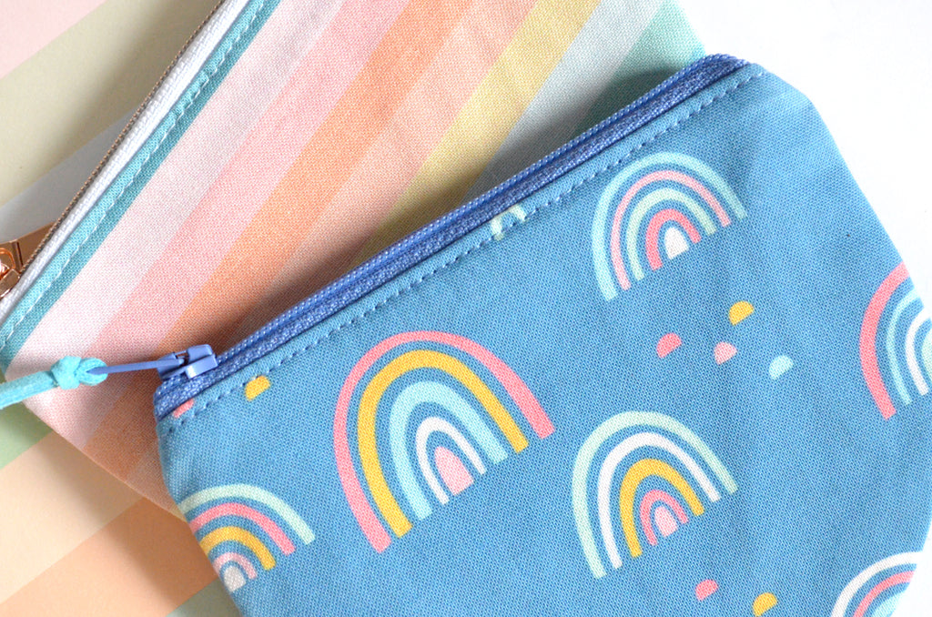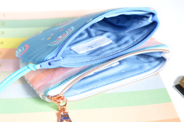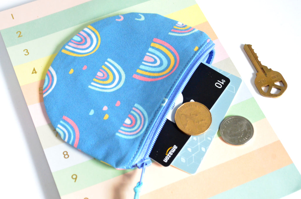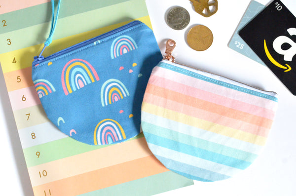 โ This blue & rainbow coin purse features a beautiful set of rainbow print fabrics!ย