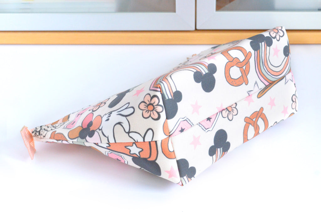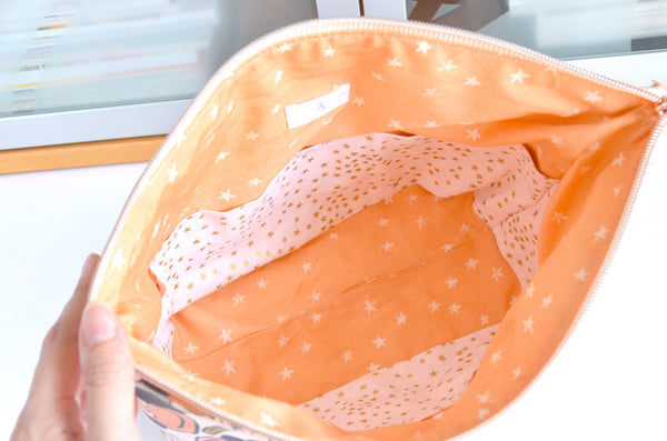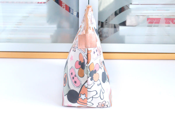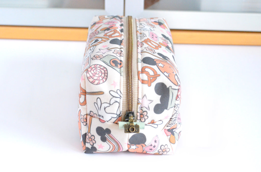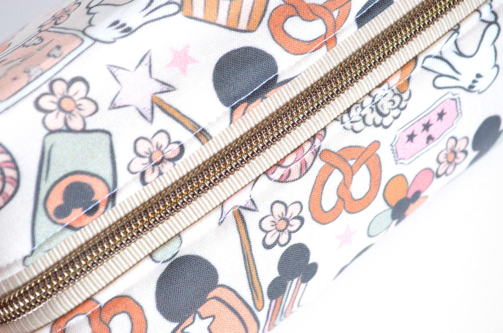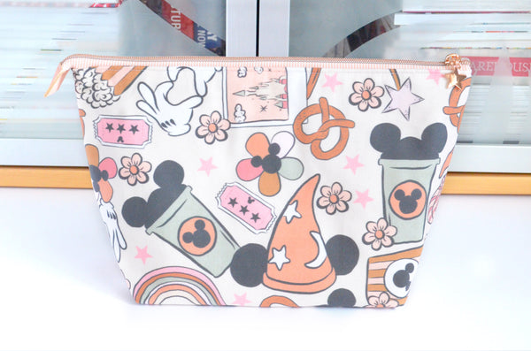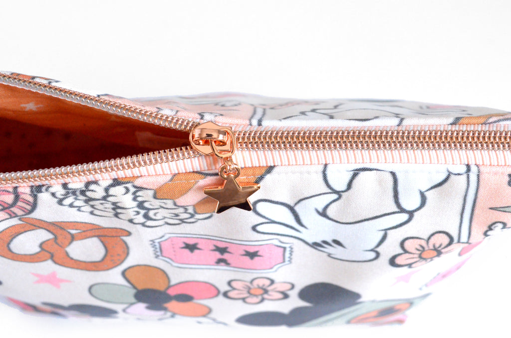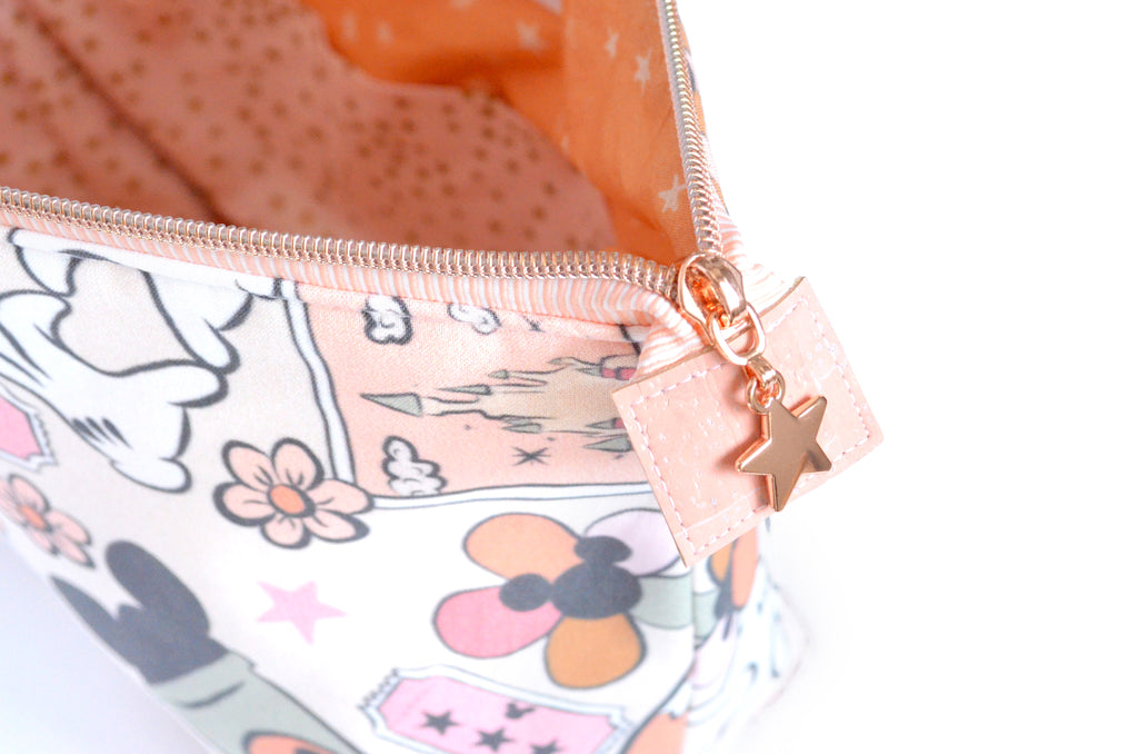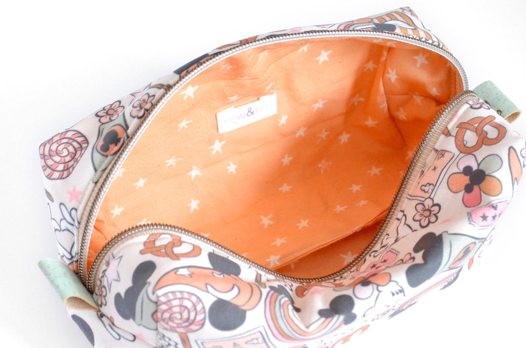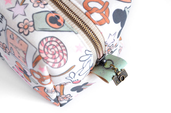 Theseย cream & pastel toiletry bags are made with a very fun cotton fabric designed by Golden June! They also feature matching faux-metal zippers & cork leather zipper tabs. Please note, exact fabric placement may vary from some of the photos shown.