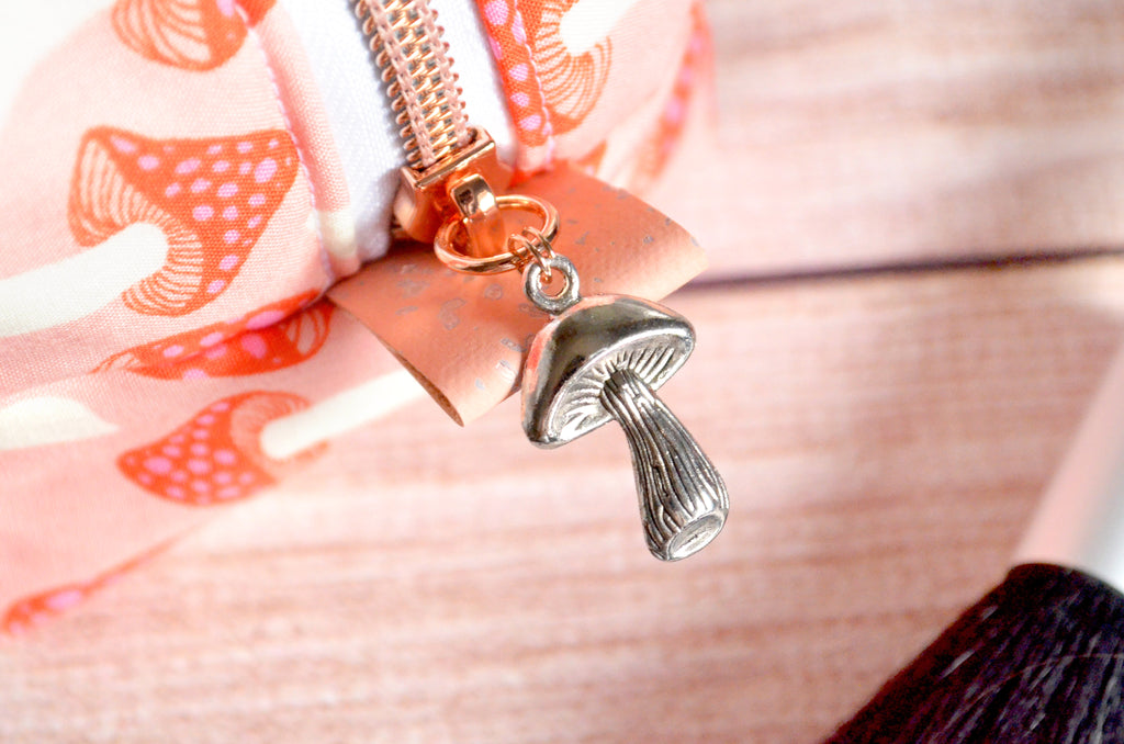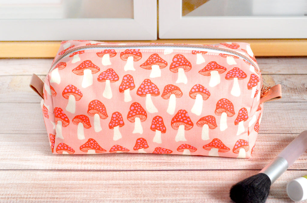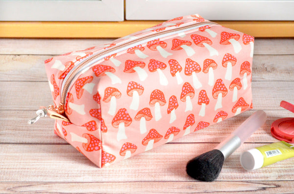 This pink boxy bag features a beautifulย mushroom print fabric!ย Itย also features a matching faux-metal zipper, and coordinating cork accent zipper tabs.ย