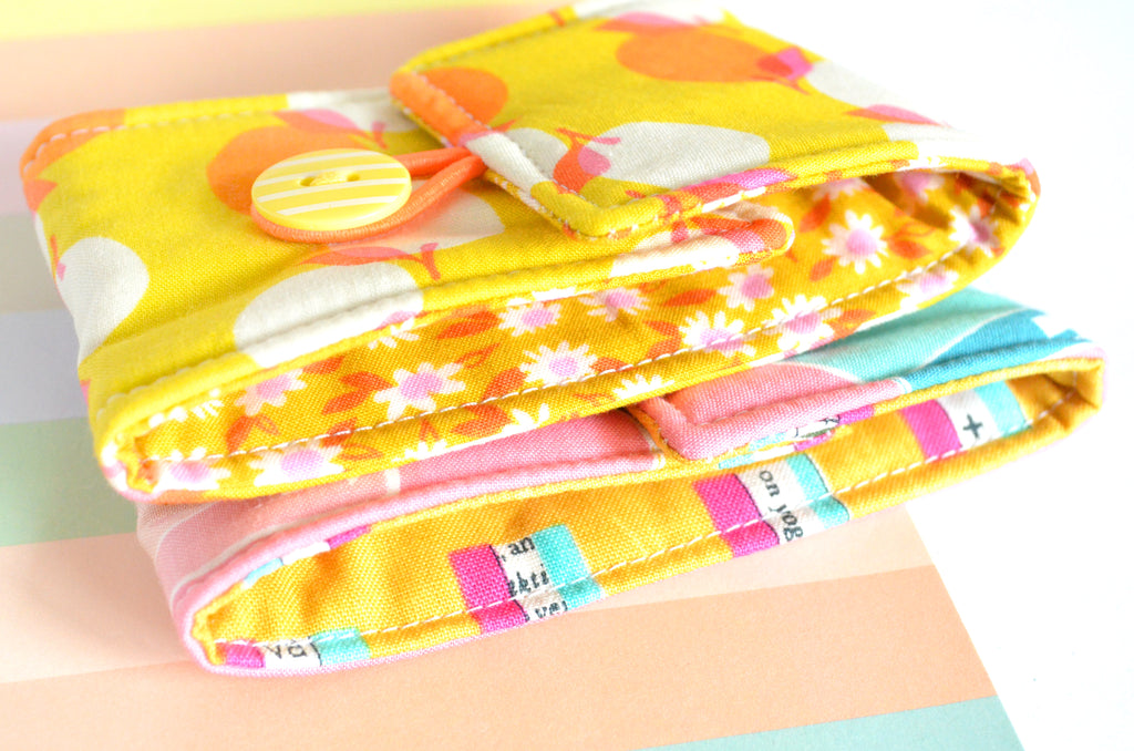 โ These yellow & pink coffee sleeves are made with a fun selection of juice printย fabrics, and paired with a matching button! Please note, exact button style & elastic colour may vary from the photos shown.