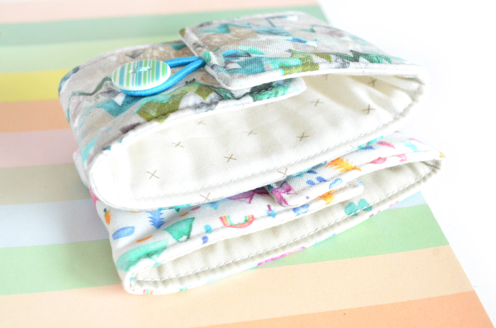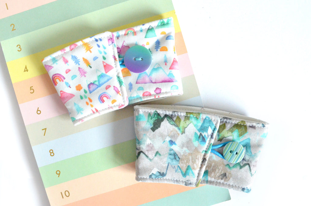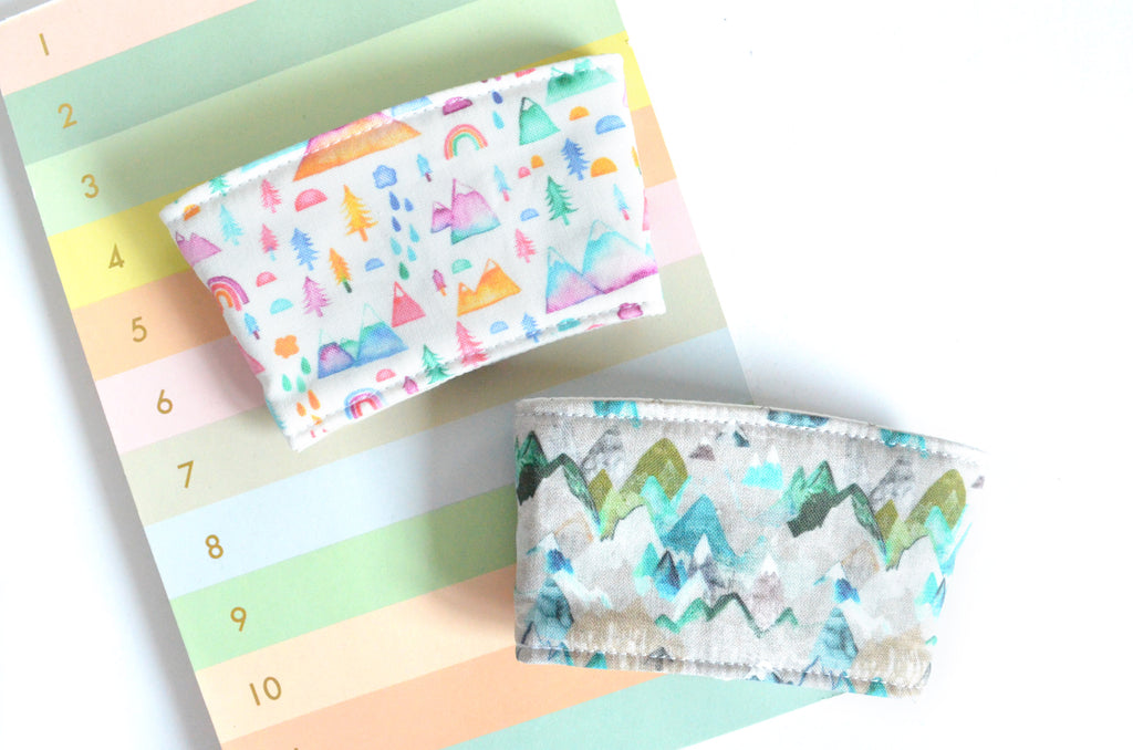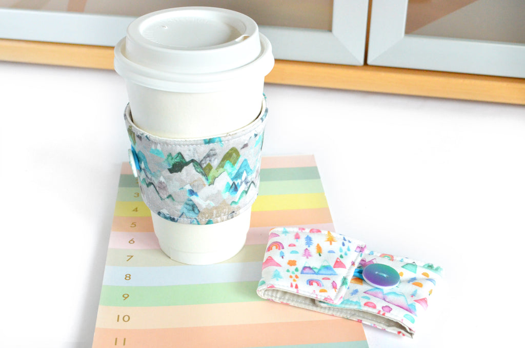 โ These blue & white coffee sleeves are made with a fun selection of mountain printย fabrics, and paired with a matching button! Please note, exact button style & elastic colour may vary from the photos shown.