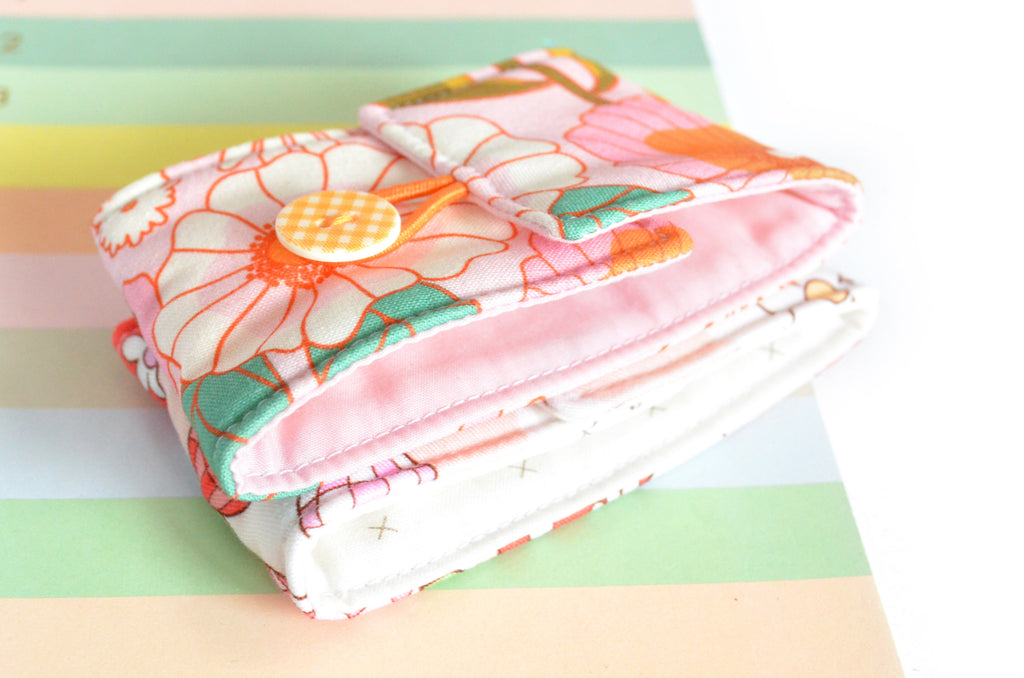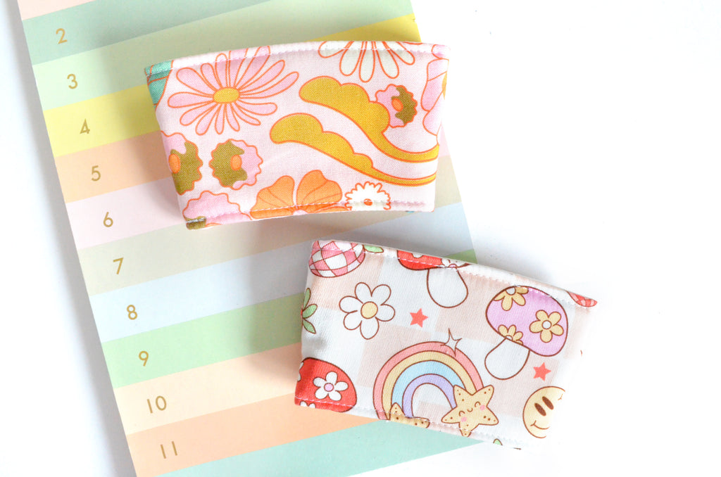 โ These pink coffee sleeves are made with a fun selection of floral & mushroom printย fabrics, and paired with a matching button! Please note, exact button style & elastic colour may vary from the photos shown.