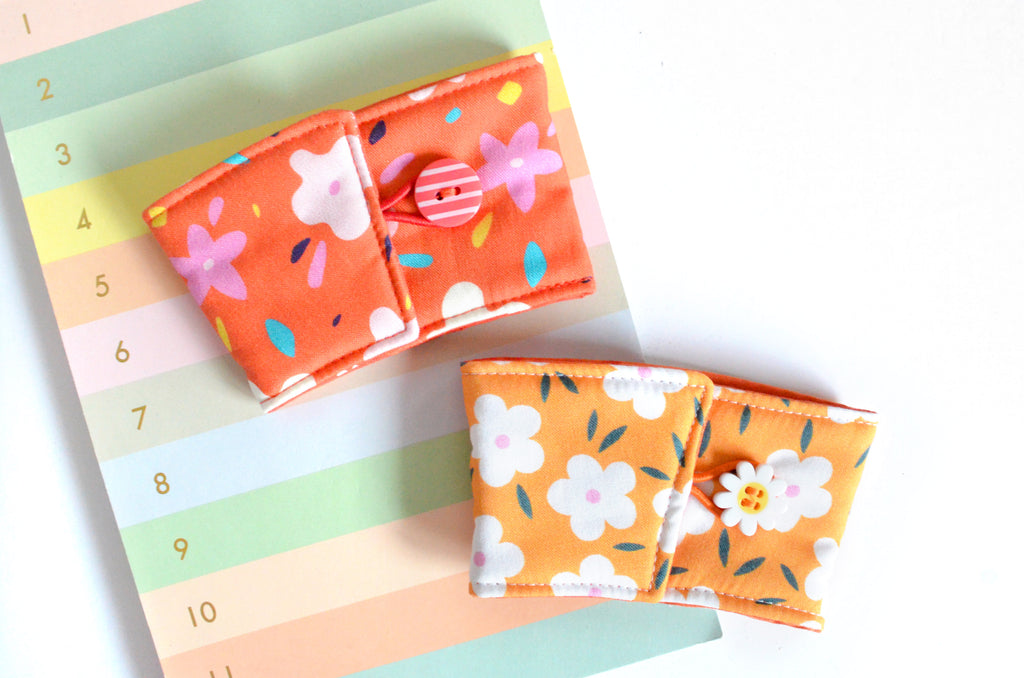 โ˜… These red & orange coffee sleeves are made with a fun selection of floral printย fabrics, and paired with a matching button! Please note, exact button style & elastic colour may vary from the photos shown.