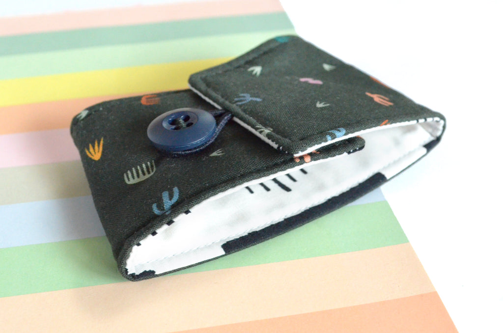 โ This black coffee sleeve is made with a fun desert-themed fabric, and paired with a coordinating button! Please note that exact fabric placement may vary from the photos shown.