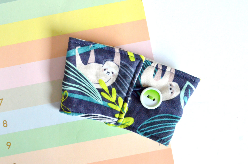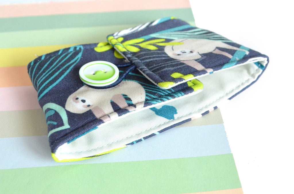 โ This dark blue coffee sleeve is made with a fun sloth-themed fabric, and paired with a coordinating button! Please note that exact fabric placement may vary from the photos shown.