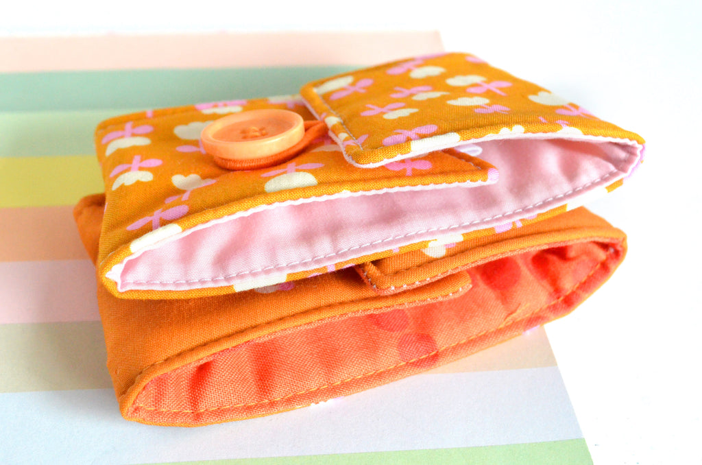 โ These orange coffee sleeves are made with a fun selection of floral printย fabrics, and paired with a matching button! Please note, exact button style & elastic colour may vary from the photos shown.