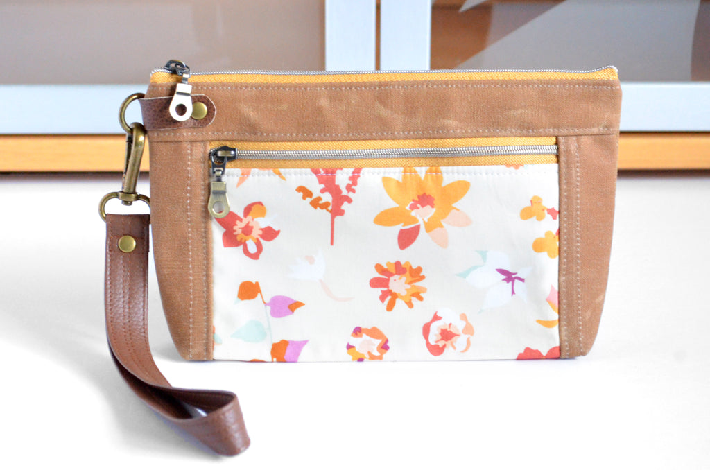 ★ This wristlet features a lovely tan-brown waxed-canvas exterior, with a beautiful floral feature panel! This bag includes a coordinating faux-leather wrist strap.