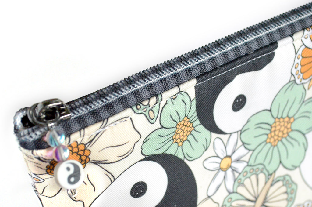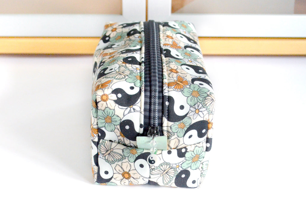 These sage green toiletry bags are made with a very fun cotton fabric featuring yin yang butterflies! They also feature matching faux-metal zippers & cork leather zipper tabs. Please note, exact fabric placement may vary from some of the photos shown.