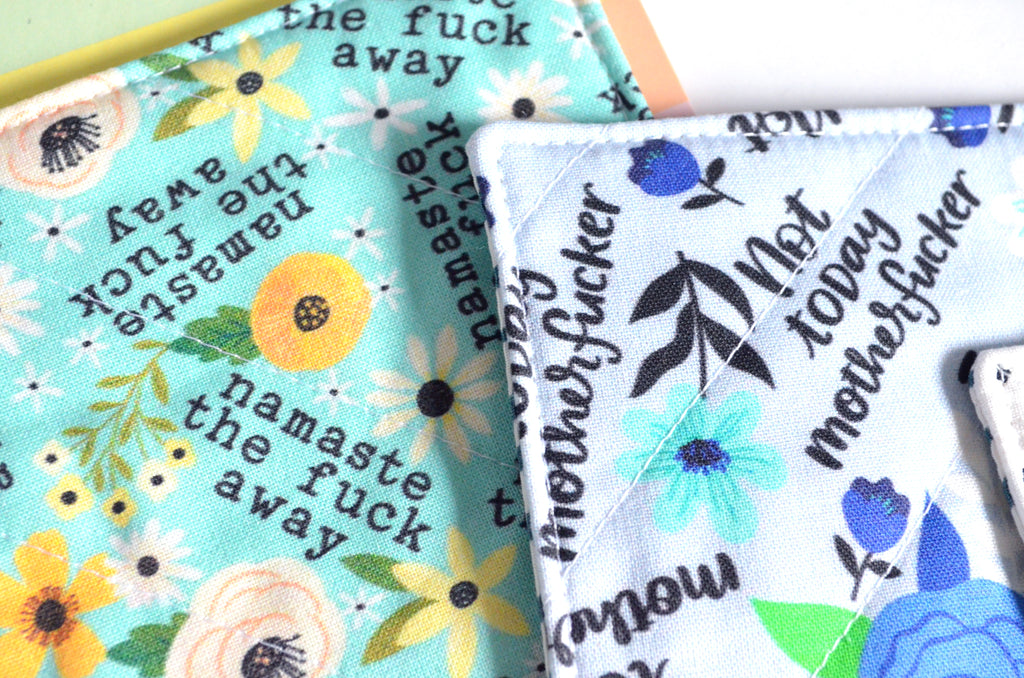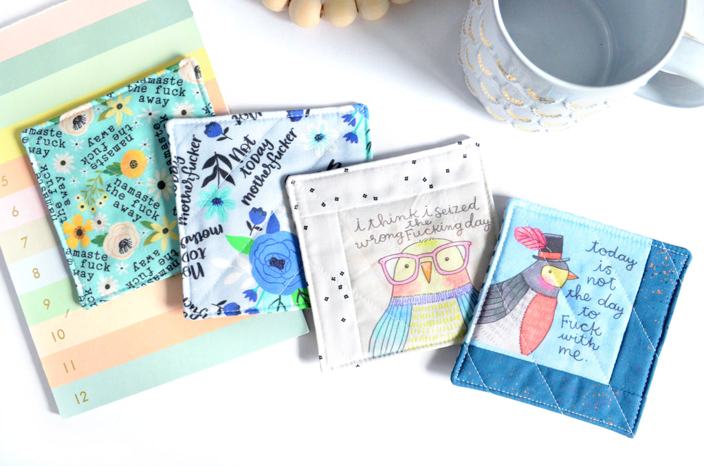 โ This set of four fabric coasters features a fun selection of fabrics withย "sweary" sayings designed by Canadian artist and illustrator Cynthia Frenette! Please note, exact fabric placement may vary from some of the photos shown.