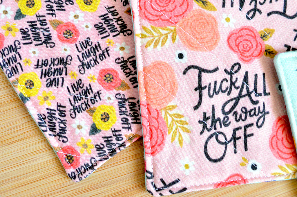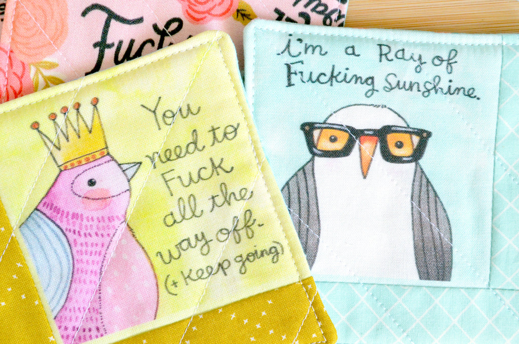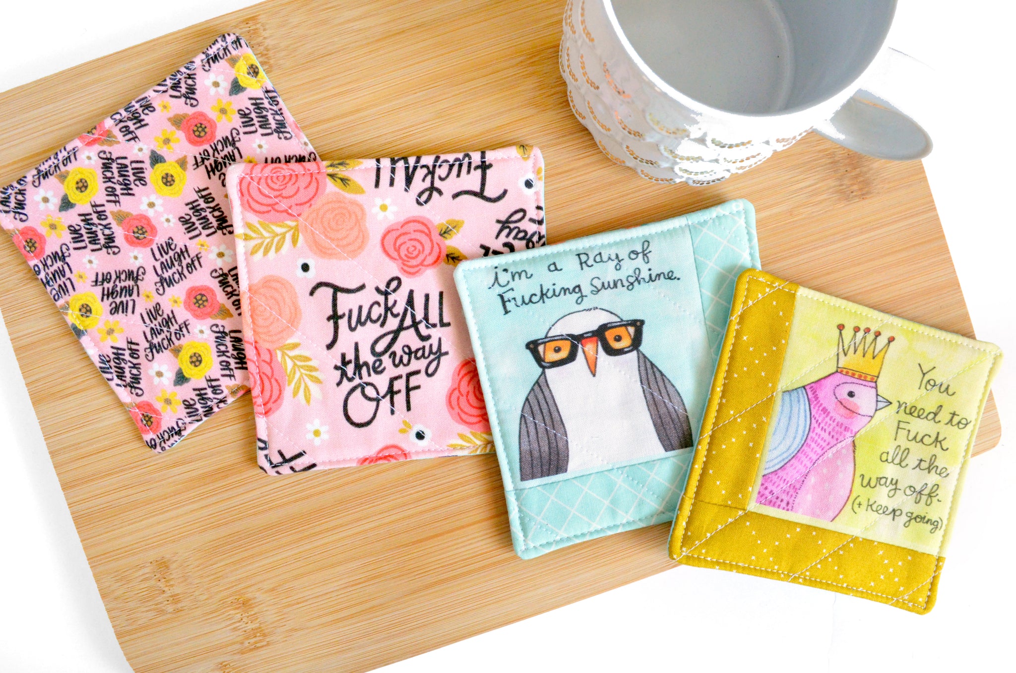 โ This set of four fabric coasters features a fun selection of fabrics withย "sweary" sayings designed by Canadian artist and illustrator Cynthia Frenette! Please note, exact fabric placement may vary from some of the photos shown.
