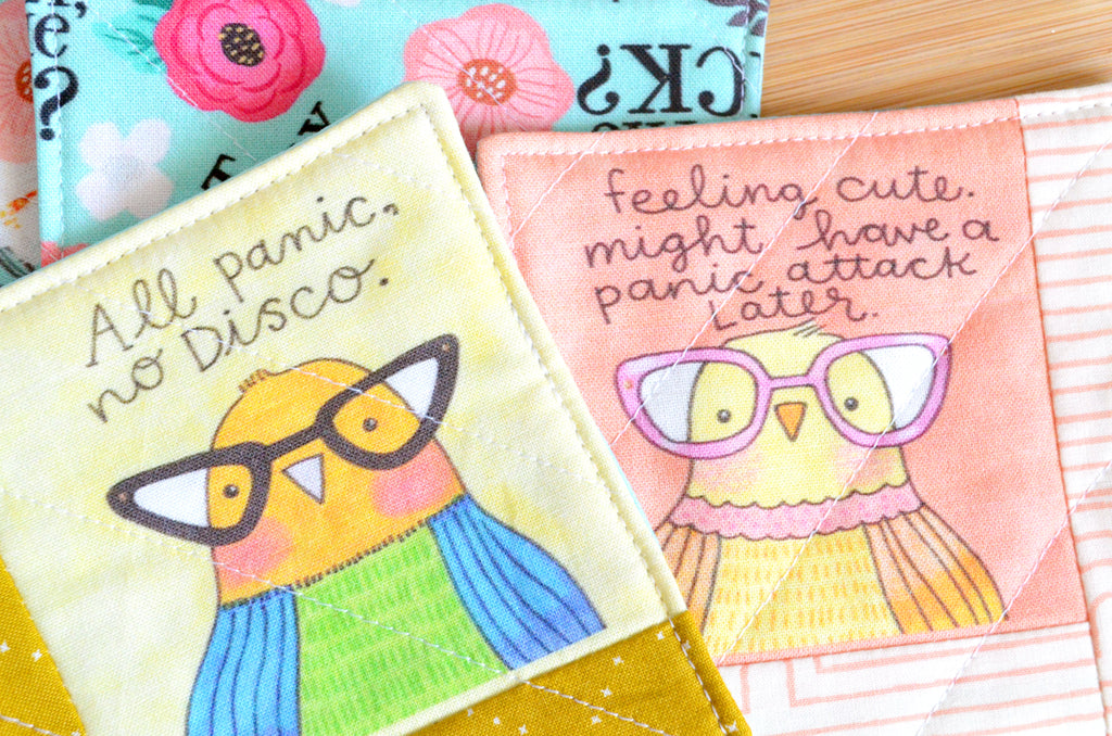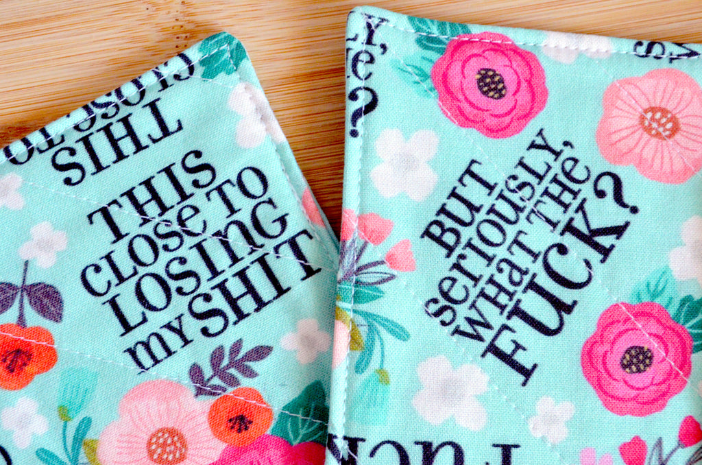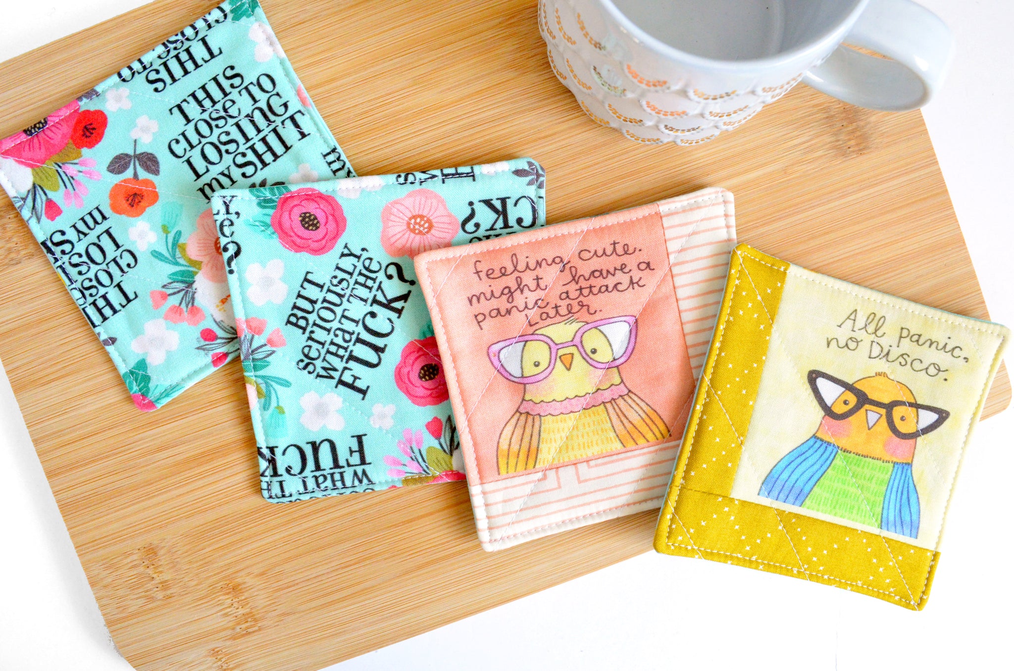 โ This set of four fabric coasters features a fun selection of fabrics withย "sweary" sayings designed by Canadian artist and illustrator Cynthia Frenette! Please note, exact fabric placement may vary from some of the photos shown.