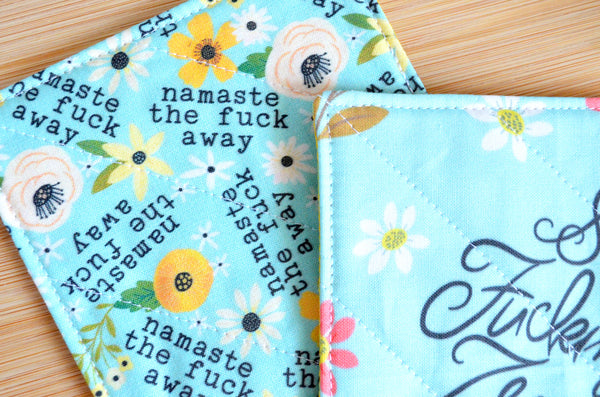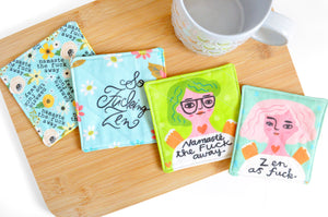โ This set of four fabric coasters features a fun selection of fabrics withย "sweary" sayings designed by Canadian artist and illustrator Cynthia Frenette! Please note, exact fabric placement may vary from some of the photos shown.