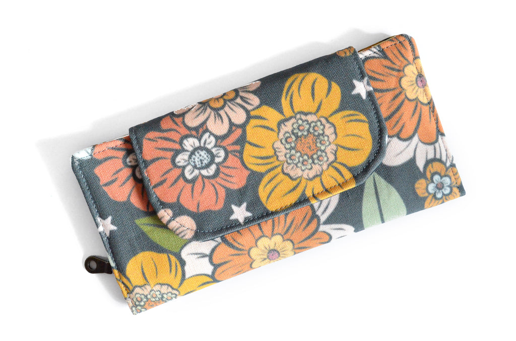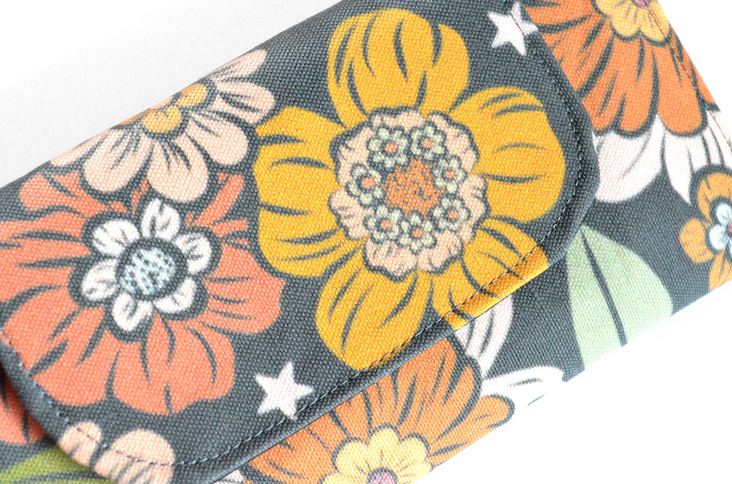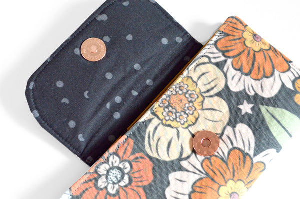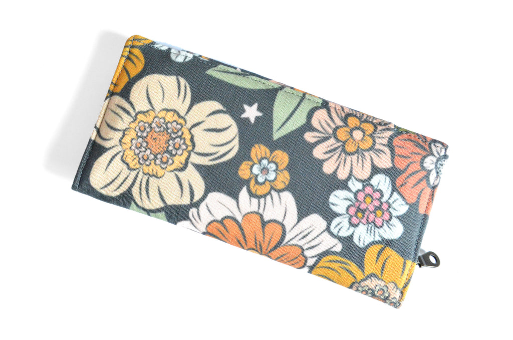 โ This wallet features a dark grey floralย canvas exterior, with a coordinating interior! Please note, exact fabric placement may vary from some of the photos shown.