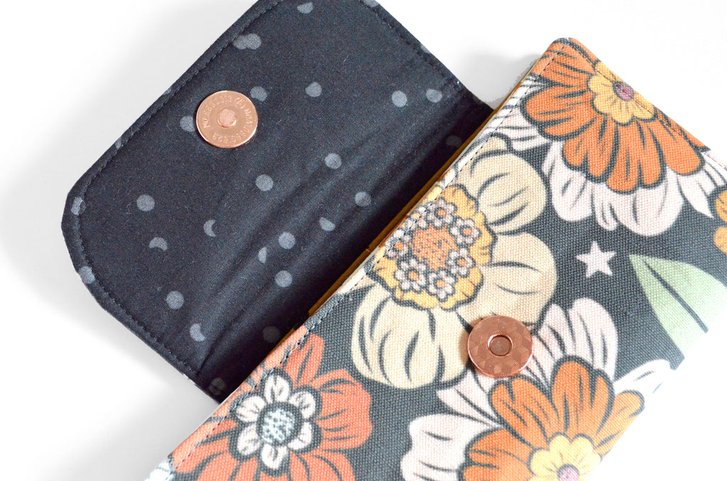 Introducing the perfect wallet for those of us who just need to carry the essentials! If youโre tired of carrying around that heavy, bulky wallet of yours, then these super slim, lightweight, minimalist wallets are perfect for you! Each wallet is made with beautiful canvas or linen fabric exteriors, which provide extra durability and longevity for use every day. The interior features six card slots, a zippered coin pocket, and two additional slip pockets, each made with coordinating cotton prints. A magnetic snap closure makes it easy to shut on the go, and keeps everything safely secured inside. Available in a variety of gorgeous prints and patterns, youโll be sure to find the perfect wallet for yourself or someone special!