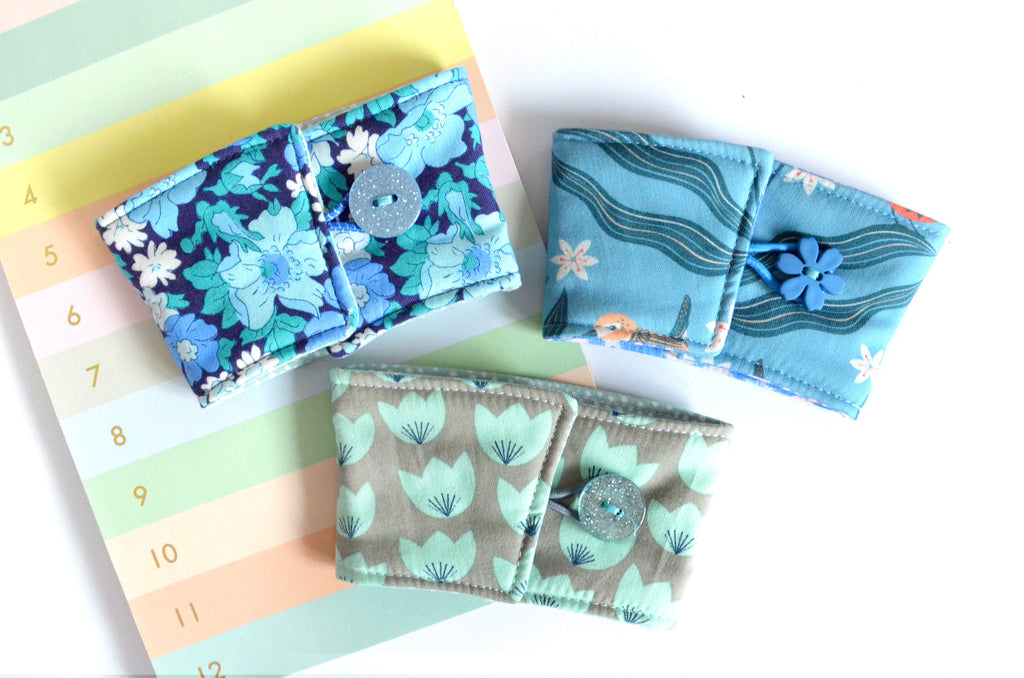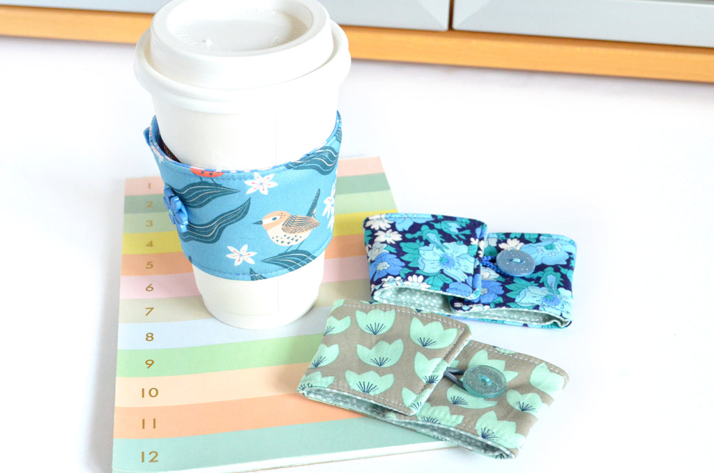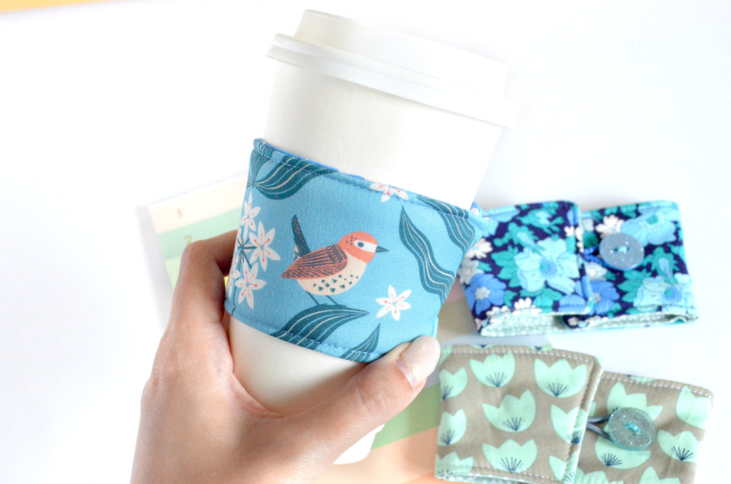 โ These blue coffee sleeves are made with a fun selection of floral & bird printย fabrics, and paired with a matching button! Please note, exact button style & elastic colour may vary from the photos shown.