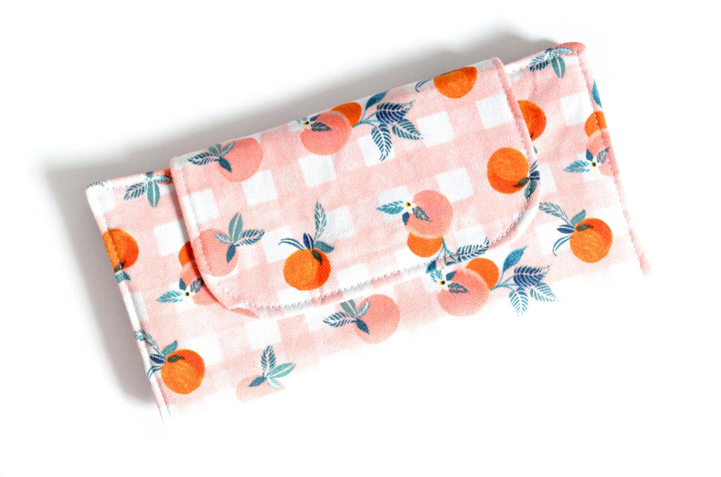 โ This wallet features a very fun peach-print canvas exterior, with a coordinating interior! Please note, exact fabric placement may vary from some of the photos shown.