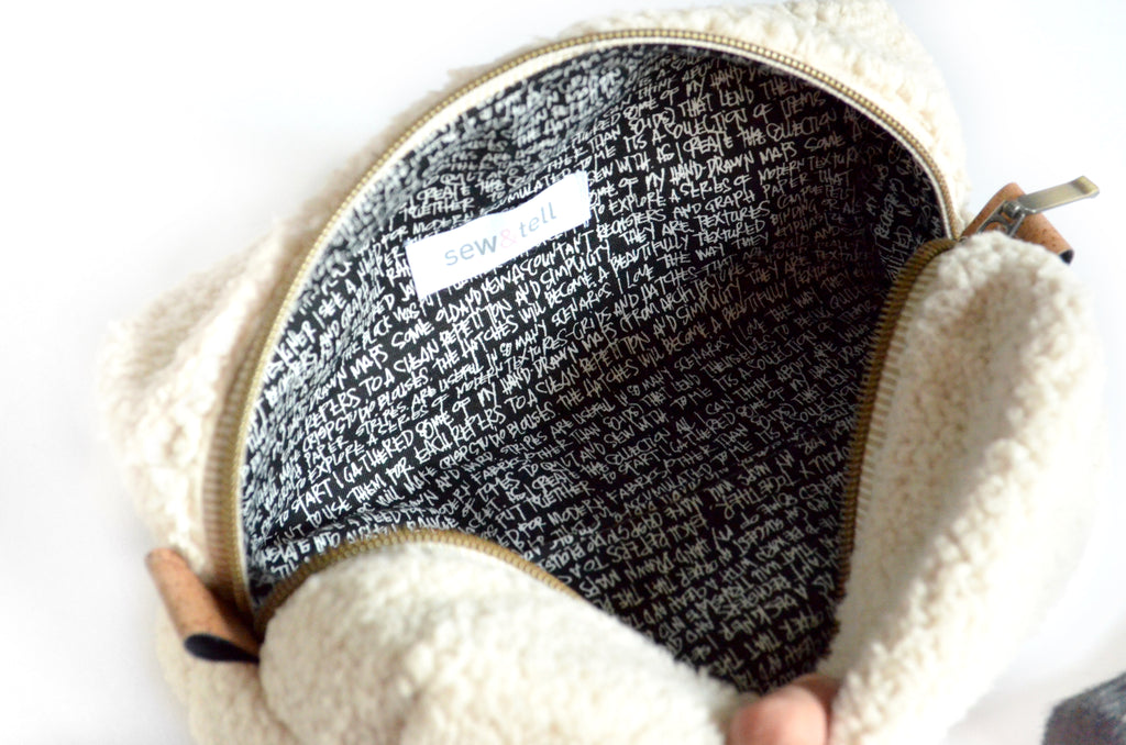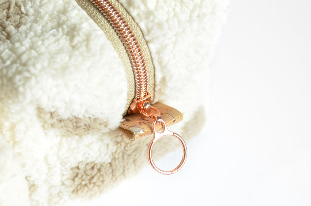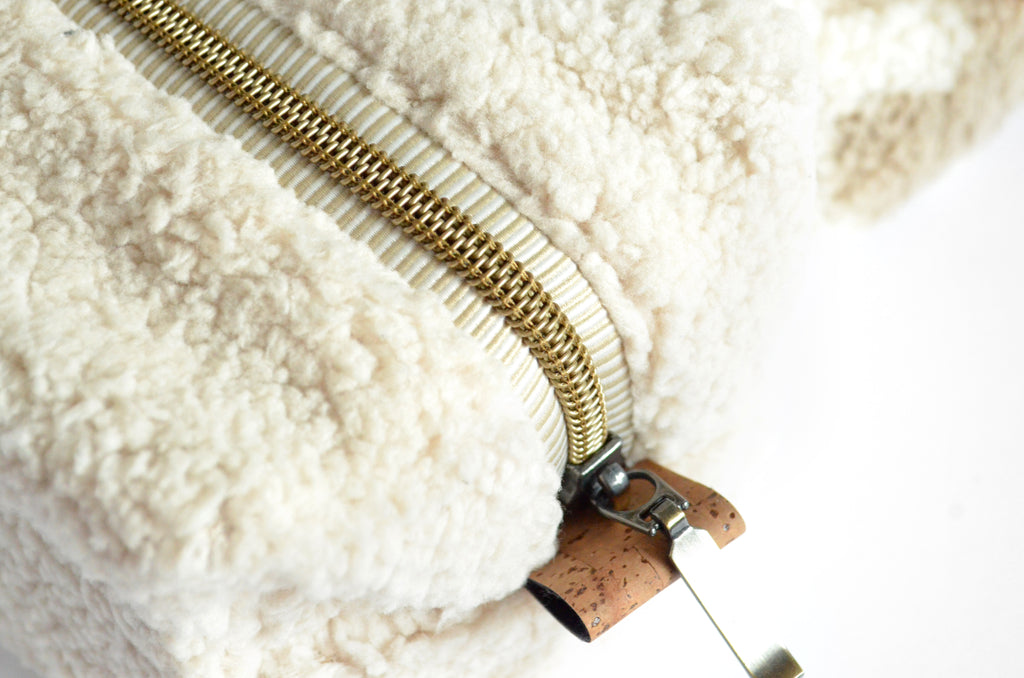 These beige boxy toiletry bags feature two very funย *sherpa* print fabrics! They also feature gorgeous faux-metal zippers in a variety of finishes, and coordinating cork accent zipper tabs.