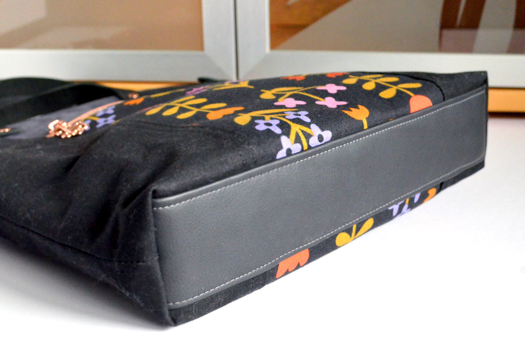 This tote bag features a black & dusty-purple waxed-canvasย exterior, with a beautiful floral canvas feature panel! This bag includes a coordinating adjustable crossbody strap.